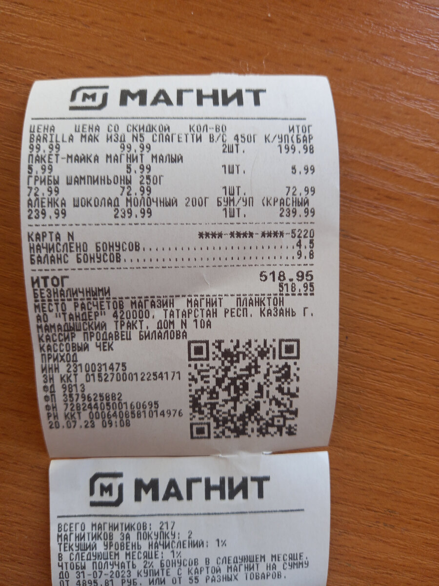Как уж без шампиньонов то ? Карим их очень любит, но сегодня какие-то они староватые, хотя годные. Я люблю покупать большие свежие шампиньоны и много. Ну уж, что есть, то есть ... Покупка вышла на 518 руб, 95 коп. Вот что я купила : Шоколад ( непременно Большой) - просила Маша. Грибы шампиньоны любит есть Карим. Ну а спагетти я варю на всех ! Друзья, Благодарю за прочтение !