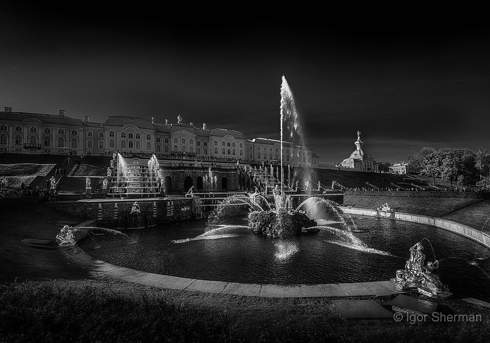 Несколько лет назад я снимал Петергофские фонтаны для одного итальянского проекта. И как это часто бывает, хотелось сделать необычный кадр, который выделялся бы из множества уже снятых фотографий главного фонтана Петродворца – Самсона. У меня возникла идея запечатлеть момент, когда луч солнца пробежит по фасаду Екатерининского дворца. Такой эффект возможен только на рассвете в начале лета. Однако с этим было две проблемы: заказ получил я уже ближе к концу лета, в это время солнце восходило за самим дворцом; во-вторых, рано утром туда просто не пускали. А проникнуть на территорию ночью или вечером и заночевать нереально, так как в таком случае меня бы обнаружили сразу же. Но затем я задумался и осознал, что это не так важно. Почему? Снимать при боковом освещении идеально - такой свет подчеркивает архитектурные детали, особенно камень. Однако стены Екатерининского дворца были оштукатурены и не имели особой фактуры. Зато флигель справа отлично дополнял композицию световым пятном, оставляя