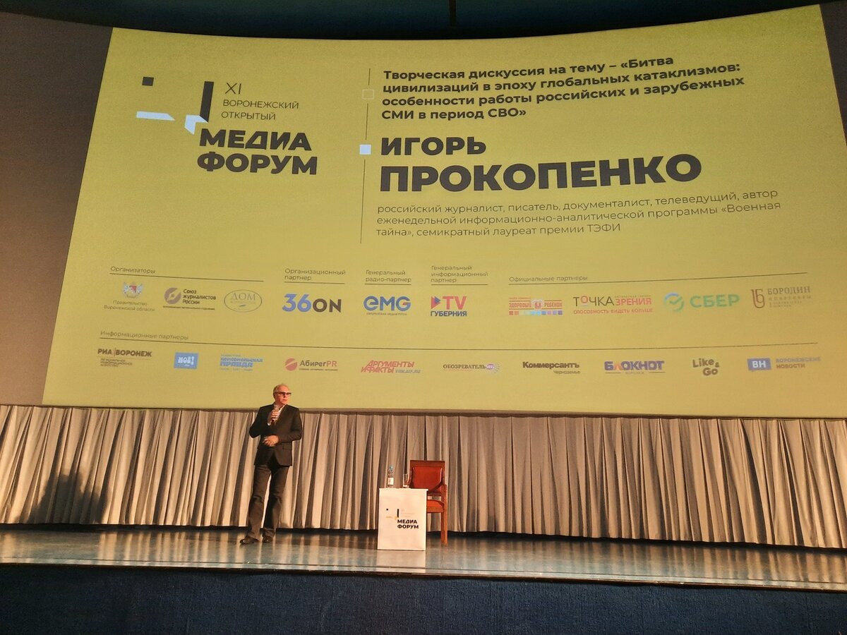Как 19 июля прошла творческая дискуссия с легендарным телеведущим Игорем Прокопенко — хедлайнером XI Медиафорума. «Что, уже началось?!», — дама в бирюзовом платье пришла сильно заранее на встречу с автором «Военной тайны» и беспокоится, что ее супруг не успеет к началу. Заверяем, что до мероприятия еще час. «Когда он на экране, муж от телевизора не отлипает», — поясняет немного взволнованно леди в бирюзовом. Если вы скептически подумали про «сходку» на тему НЛО, то пора уже «снять» шапочку из фольги и когнитивных предубеждений. Программы Игоря Прокопенко выходят в эфир более 25 лет. На вопрос «В чем секрет успеха?», телеведущий неизменно отвечает, что это все заслуга аудитории. 19 июля, на XI Воронежском открытом медиафоруме[x] мы смогли в этом убедиться лично. «Битва цивилизаций в эпоху глобальных катаклизмов: Особенности работы российских и зарубежных СМИ в период СВО» — так была заявлена тема творческой встречи Прокопенко в Воронеже. Исходя из названия, можно предположить, что спик