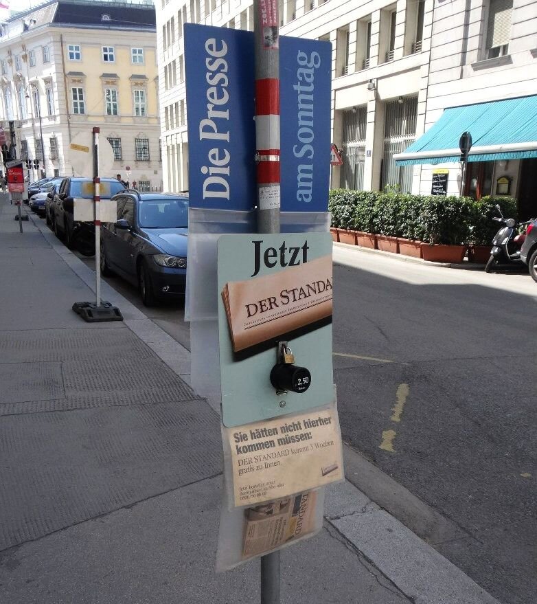 Пожалуй, одной из самых самобытных, по-своему милых и даже обескураживающих австрийских особенностей является торговля газетами, основанная на доверии. Выглядит на практике это следующим образом: На уличном столбе или, например, на дорожном знаке крепится реклама того или иного печатного издания, а под ним – прозрачный пластиковый пакет с несколькими экземплярами последнего номера. Там же, на столбе, устанавливается специальная коробочка, вроде копилки, куда нужно бросить несколько монет евро, после чего из пакета можно будет взять газету. Но главное, что газету можно совершенно спокойно [угрызения совести не в счет] взять, не бросая монет. Система рассчитана исключительно на честность потенциальных читателей. Более того, точно такую же газету можно купить у продавца в ларьке неподалеку. Но, если прогуляться лень, или просто нет времени, подобные столбы с газетами всегда к вашим услугам. Точнее, к услугам австрийцев, которые исправно бросают монетки и лишь потом берут газету.