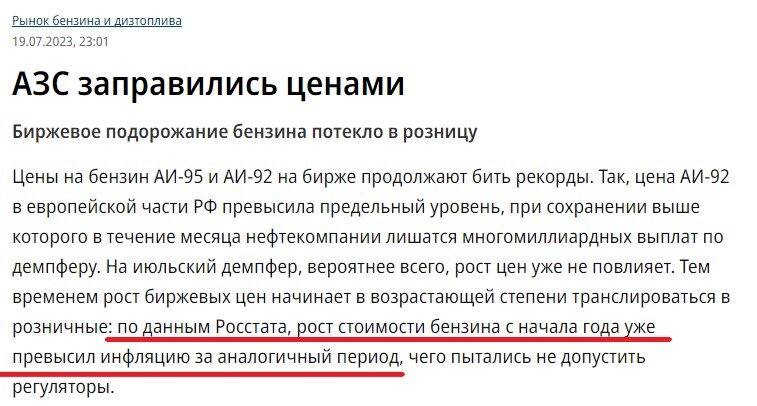Ситуация с ценами на бензин продолжает развиваться в негативном направлении. Оптовые биржевые цены чуть ли не ежедневно бьют рекорды, и это уже все сильнее начинает отражаться ра розничных ценах. В июле, наконец, случилось то, чего усиленно старались не допустить власти: официальный росстатовский рост цен на бензин с начала года превысил официальный уровень инфляции. Если в цифрах, то рост топлива на заправках составил 3,6% с начала года, а общий уровень инфляции за это же время - 3,15%. Почему это плохо? Потому что цена топлива входит в себестоимость практически любого товара или услуги. Если дорожает топливо - дорожает все. А если топливо дорожает сильнее, чем все, то и все подорожает еще сильнее. Нельзя говорить, что государство не пыталось сдержать этот рост цен. Пыталось. Но "своими" методами: угрозами, запретами. Например, ФАС в июне грозила 9 российским компаниям уголовными делами, если они не будут продавать на бирже больше бензина. Но продавать топливо в убыток можно заставить