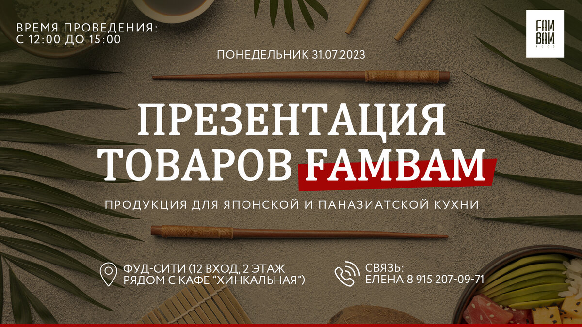 Уважаемые гурманы и любители японской и паназиатской кухни! Мы рады пригласить вас на уникальное мероприятие - презентацию товаров FamBam! Наш шеф-повар Александр Ким собрал для вас самые вкусные и полезные продукты, которые помогут вам создать настоящий вкусный шедевр в своей кухне. 31 июля мы проведем мастер-класс, где вы сможете насладиться процессом приготовления блюд из нашей продукции. Вы узнаете секреты приготовления самых популярных азиатских блюд, получите полезные советы и сможете задать все свои вопросы экспертам.