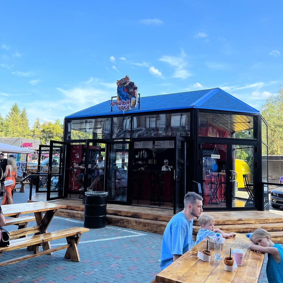 Бар «Крылья Чака» работает в ресторанном дворике за гостиницей Центральная. Это отдельное помещение с большими окнами — проект пивоварни «Йохохо». Помещение симпатичное. Весь дворик как на ладони. В меню разнообразные крылья и попкорн. Из напитков — пиво производства «Йохохо». Гордость заведения — острые крылья. Их и взял. Крылья Крутой Уокер по 350 ₽ за пять штук. В меню крылья описаны так: копчёные крылья по-техасски с острейшим BBQ соусом, для по-настоящему крутых рейнджеров. С заказом дают влажную салфетку и перчатки. Это плюс. Первое, что бросается в глаза — крылья очень маленькие, словно это крылья цыплят. При этом видно, что используются все части крыльев — и там, где мяса побольше, и где его почти нет. А что, так можно было? В чём действительно не откажешь — соус действительно очень острый. Вообще, я принадлежу к тем людям, которые считают, что, если пить пиво с очень острой закуской, вкуса пива не почувствуешь. Тут хоть тормозной жидкостью запивай — разницы особо не почув