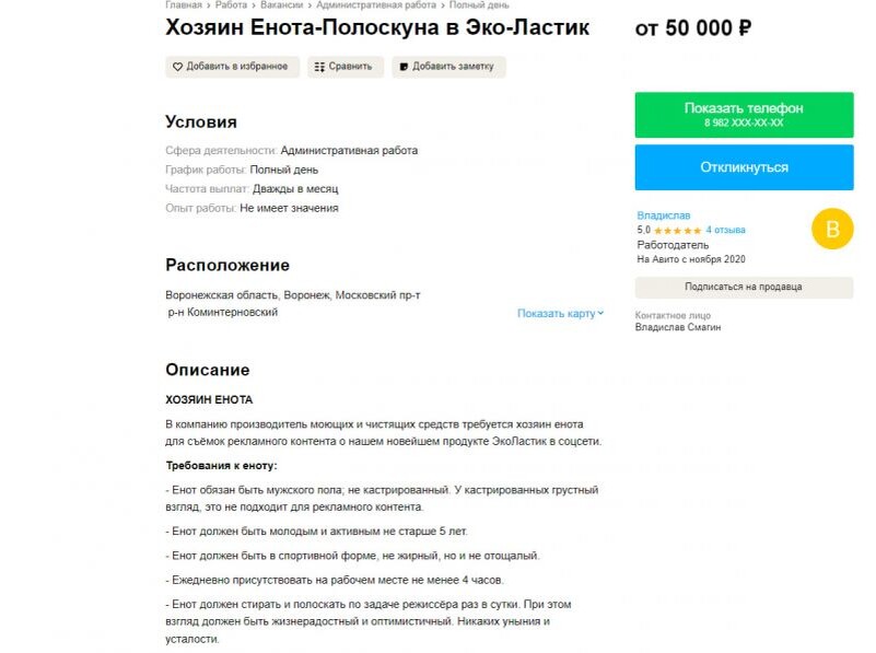 Воронежская компания моющих и чистящих средств ищет енота для рекламных съемок. Соответствующее объявление разместили на «Авито». Ежемесячная зарплата – 50 тысяч рублей. Авторы вакансии выдвинули большой список требований к еноту. Во-первых, енот должен быть мужского пола, но не кастрированный. У таких животных взгляд грустный и это не подойдет для рекламного ролика. Он должен быть молодым и активным, не старше 5 лет. Во-вторых, енот должен быть в спортивной форме, а его взгляд жизнерадостным и оптимистичным. Присутствовать на работе следует не менее 4 часов ежедневно. В его обязанности будет входить: стирать и полоскать по команде режиссера. Ходить по нужде ему придется до работы, ведь у работодателя ничего не обустроено под туалет животного. Также нельзя орать и отвлекать сотрудников от работы. Зверек должен быть тихим и воспитанным, в особенности трезвым (как отмечает автор вакансии подобные прецеденты были). В обязанности енота также будет входить снятие стресса у работников: «Приш