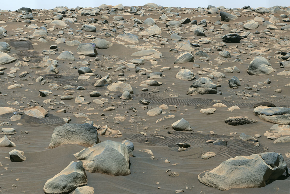 6 июля камера Mastcam-Z на марсоходе NASA Perseverance сделала серию снимков, которые были сшиты вместе, чтобы показать поле валунов, отложенных в кратере Джезеро быстро текущей древней рекой. Следы вездехода в середине изображения создают ощущение масштаба.