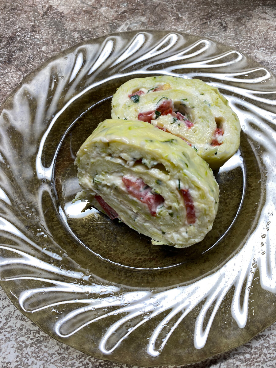 Нашла этот рецепт на просторах интернета, немного подкорректировала и получилась ну очень вкусная закуска из кабачка. Обязательно попробуйте!!! Нам понадобится: РУЛЕТ: Кабачок - 550гр (отжатого) это примерно 2 небольших кабачка Мука - 3-4 ст.л с горкой Яйца - 3шт соль сметана - 1-2 ст.л. НАЧИНКА: плавленные сырки - 3 шт сметана - 2ст.л. чеснок - 1-2 зубчика зелень (укроп, лук) по вкусу Помидор Подготовим все ингредиенты Кабачки натираем на терке, хорошо отжимаем, солим, даем немного постоять (3-5мин) и еще раз отжимаем. Далее к отжатым кабачкам добавляем яйца, сметану, муку и хорошо перемешиваем. Выкалываем на разнос, застеленный пергаментной бумагой, и отправляем выпекаться в духовку, разогретую до 180 градусов, минут на 20-25. Для начинки сырки натираем на терке( можно перед этим положить их в морозилку минут на 10, чтобы легче натереть ), добавляем сметану, чеснок, зелень, хорошо перемешиваем. На готовый рулет намазываем начинку, сверху выкладываем нарезанные помидоры и завор
