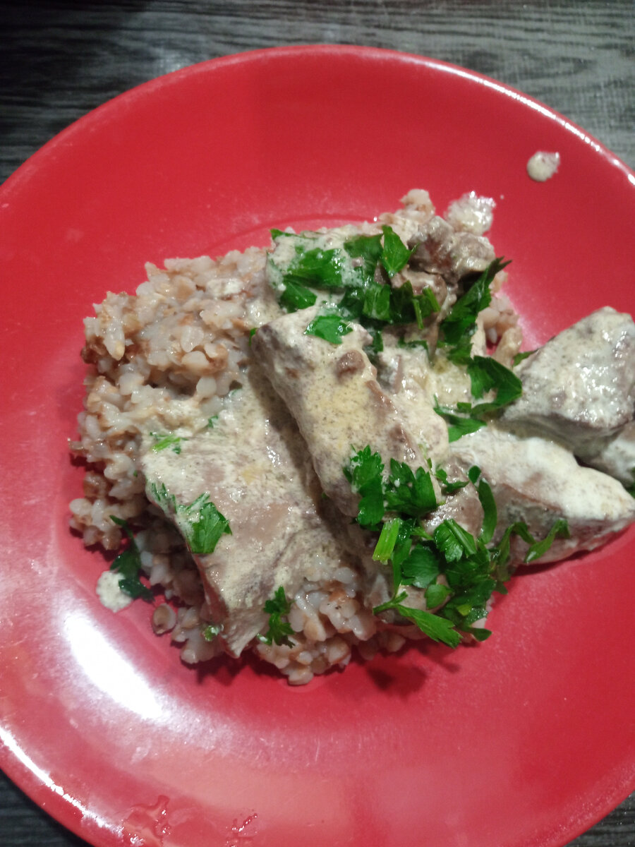 По дороге домой покупаем печень индейки Режем кусочками и заливаем молоком Пусть постоит минут 20-30. В это время обжариваем лук. Сливаем молоко и добавляем печень в сковороду к луку. Обжариваем до готовности, добавляем сметану, соль, специи. Выключаем и посыпаем зеленью. Пока готовим печень уже готова и гречка. Добавляем в гречку сливочное масло - вкуснота: - Любишь? - Кого? - Гречку!