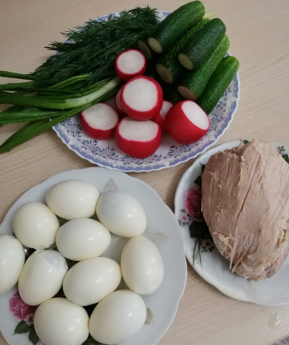 Нам понадобятся отварные яйца, отварное нежирное мясо, свежие огурчики, редис, зелёный лук и укроп. Всё это мелко нарезается, можно измельчить на терке один огурчик и пару редисок, это придаст окрошке особый аромат.