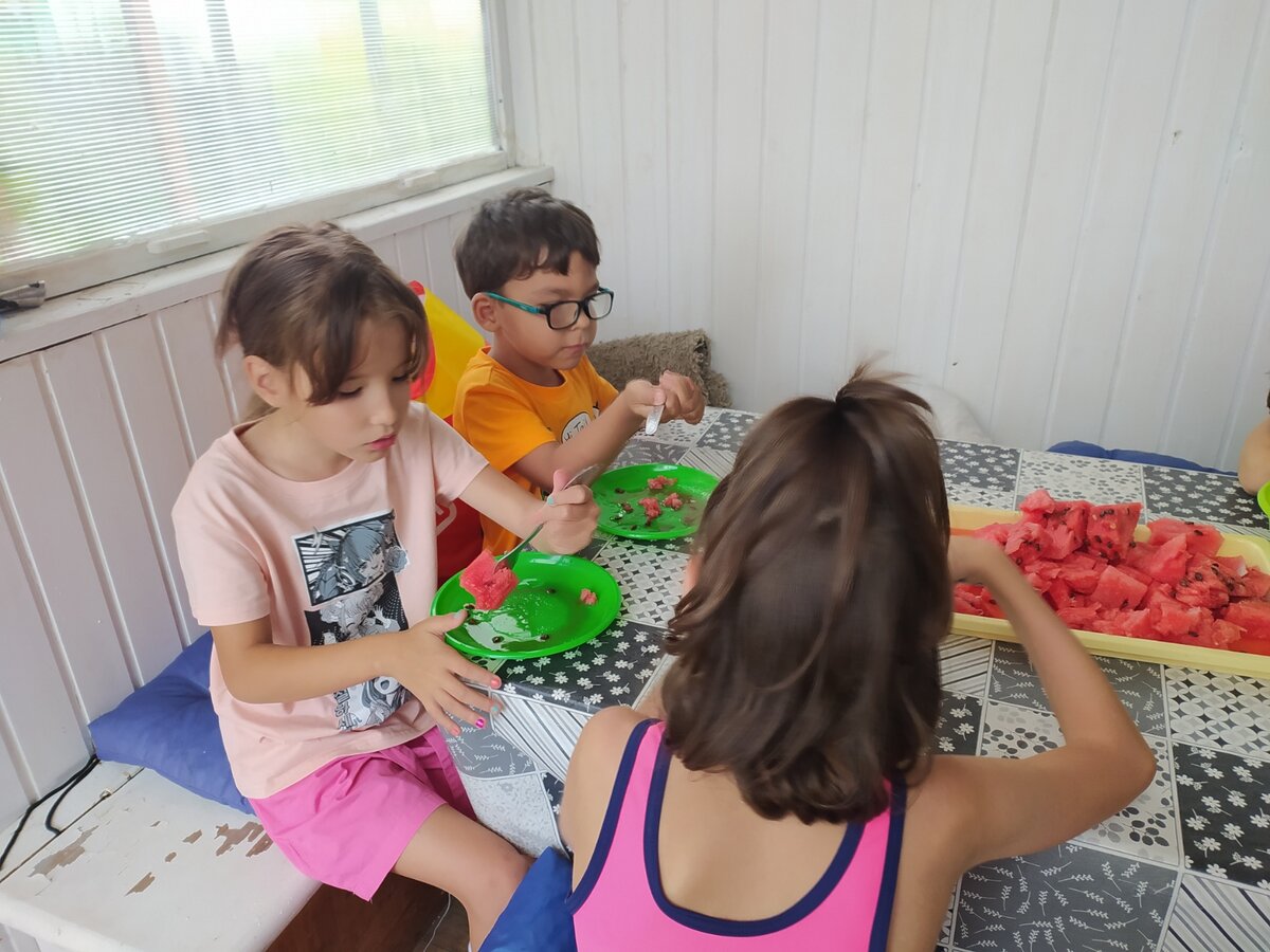 Отдохнули мы очень хорошо. Было жарко, но пасмурно. Дедушка купил детям большой арбуз. Ребятишки купались и загорали. И я вместе с ними. Дочитала очень интересную книжку про абьюз в отношениях, которую брала в Фикс Прайсе. Дедуля все же согласился в этот раз приготовить шашлык :))) Дети были счастливы. Заодно пожарили зефирки, которые в прошлый раз брали. До этого мы пытались жарить маленькие, ерунда вышли. А эти специально предназначены для барбекю :))) Оказались очень вкусные, карамельная корочка сверху и как крем внутри. Ребятишки напарились в бане, напрыгались в бассейне, а потом до 11 вечера скакали на батуте. Я же ничего на даче не делала, кроме поддержания порядка и приготовления еды. Зато занималась с Полей холдинг-терапией. А попросту обнимались. Полю вроде стало отпускать. Но теперь она боится других людей :( и ни к кому не идет на руки. Зато на мне висит, как обезьянка. и крепко держит мои руки, что бы они её обнимали. А еще периодически чего-то пугается и впадает в си