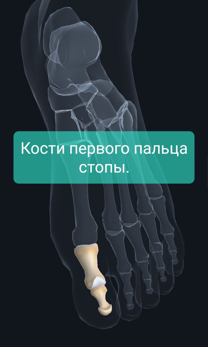 Первый палец стопы, он же большой (как и первый палец кисти), в отличие от остальных пальцев, состоит из двух фаланг - проксимальной (или основной) и дистальной (или ногтевой). Кости эти - которкие трубчатые. Среди пальцевых фаланг эти - самые крупные. Нужно это, чтобы можно было использовать большой палец, как основную точку отталкивания при ходьбе и беге. Вернее наоборот: первый палец - главный по толканию, поэтому его фаланги самые крупные. А некоторые приматы еще и противопоставлять первый палец стопы могут - чтобы стопой хватать, как ладошкой. Проксимальная фанга по форме приближается к цилиндру. К проксимальной части проксимальной фаланги (да, масло масляное, но так и называется - "ближняя", значит, к организму), с подошвенной (нижней) стороны крепятся сухожилия короткого сгибателя большого пальца стопы, а также мышц, этот палец отводящей и приводящей. Там же, рядышком, находится суставная поверхность для соединения с первой плюсневой костью. И всегда там снизу есть сесамовидны