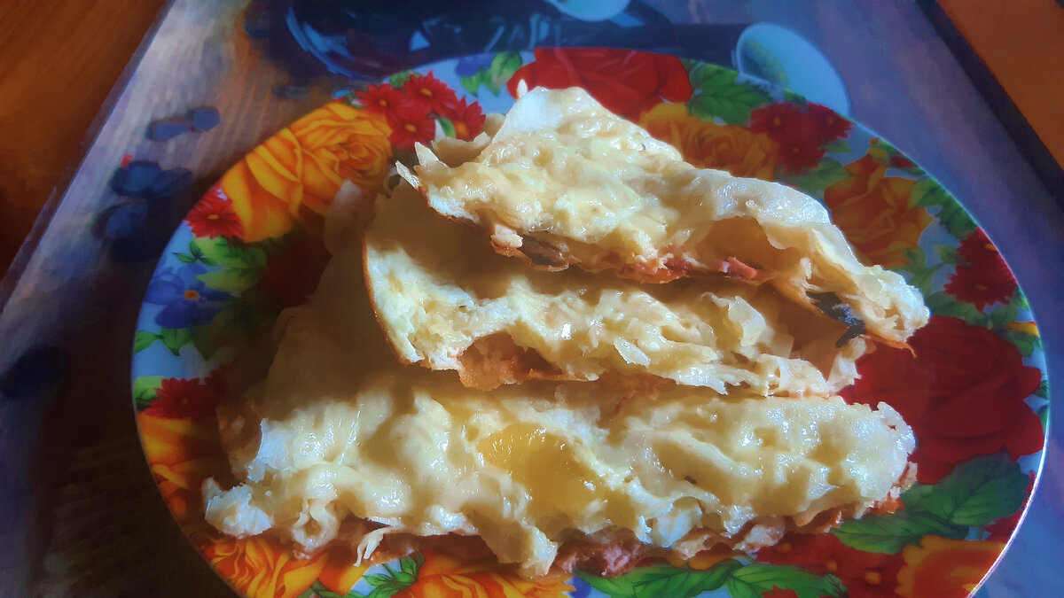 8. Накройте все вторым кружочком лаваша, густо посыпьте натертым твердым сыром.