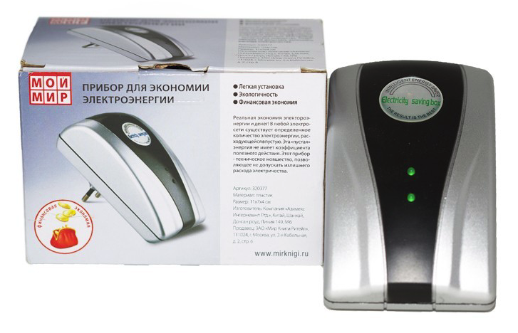 Порекомендовал ваш сайт знакомым», Виктор, Нижний Новгород Хороший и полезный прибор, С ним цена на свет не кажется уже такой большой, Окупился за 2 месяца, сейчас только в плюсе от его использования, Светлана, Камышин «Спасибо за высокое качество, До этого уже покупала один такой экономитель, но он оказался бесполезным, а через 2 недели вообще перестал работать, Повелась на низкую цену, После этого купила у вас, В прошлом месяце заплатила 620 рублей, вместо 900-1000 руб, как раньше, Сэкономили 300-400 руб, Пользовались всем тем же, что и раньше, Довольна», Марина, Ростов-на-Дону «Отличное решение для квартиры и офиса, Купил туда и туда и теперь плачу почти на 2000 руб, в месяц меньше, Если все так пойдет и дальше, за год получится почти 24000 руб, Хоть я и не очень люблю экономить, но считаю, не стоит оплачивать то, чем не пользуешься, Зачем выбрасывать деньги на ветер?», Кирилл, Екатеринбург скидка 50% Как использовать Вставьте прибор в любую электрическую розетку, Начните экономить на счетах за электроэнергию прямо сейчас, используя уникальный прибор ELECTRICITY SAVING BOX Ваша сеть защищена от реактивной энергии Ваша сеть защищена от реактивной энергии, электроприборы потребляют меньше энергии, Из физики известно, что энергия бывает активной и реактивной, Активная энергия является полезной – именно она используется электроприборами для работы, Реактивная является «побочной и ненужной», Она курсирует по проводам и создает дополнительную нагрузку в сети, Как следствие, увеличивает ток потребления, а также наводит множество вредных для здоровья электромагнитных полей, Экономьте на платежах за электроэнергию Ежемесячные платежи станут на 30-50% меньше, чем были до использования ELECTRICITY SAVING BOX, Сберегатель. Экономитель Электрической Энергии. Это простое устройство сэкономит Ваши деньги, не требуя от вас никаких усилий.убирает реактивную составляющую из сети, в результате чего снижается нагрузка и, как следствие, ток потребления, Электроприборы потребляют меньше электроэнергии, снижаются затраты на ее оплату, Технические характеристики Предназначен для стандартной электрической сети в квартире или доме, Максимальная влажность воздуха – 85% (не устанавливать в ванных комнатах и бассейнах), Допустимая нагрузка 5кВт – 19 кВт (одного прибора хватает на всю квартиру), Вес: 170 грамм с упаковкой, 125 – без упаковки, Размеры: 12см x 7см x 4см, Гарантия – 1 год, Действие ELECTRICITY SAVING BOX впечатляет!