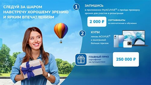 Подробнее https://reklamnyeigry.ru/2023/07/20/%d1%81%d0%bb%d0%b5%d0%b4%d1%83%d0%b9-%d0%b7%d0%b0-%d1%88%d0%b0%d1%80%d0%be%d0%bc-2023/ Чтобы принять участие в рекламной акции Следуй за шаром 2023 необходимо с 01 июля 31 октября 2023 года: 1. Скачать приложение MyACUVUE®, зарегистрироваться и записаться в удобную оптику на проверку зрения; 2. Пройти проверку зрения и участвовать в розыгрыше еженедельных призов; 3. Купить упаковку контактных линз ACUVUE® с кодом из приложения онлайн или в оптике-партнере; 4. Участвовать в розыгрыше ежемесячных суперпризов и главного приза по итогам всей акции. Призовой фонд: