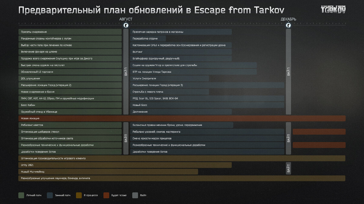 Разработчик продемонстрировал дорожную карту с планами развития игры до конца 2023 года. В ожидании вайпа, возродили систему рейтинга https://www.escapefromtarkov.com/rating с потрясающей наградой. Победители в любой из категорий получат две дополнительные строчки НАВСЕГДА. По доброй традиции раздавали промокоды с ценным лутом: 1CLICKDRESSUP | BARMALEY | S00NS00N | TRAMBON | PINEWOOD Ближайший ВАЙП случится в Августе и вот что тебя ждет: Песеты Снаряжения Аналог сборок оружия, только всего снаряжения, сохранённый пресеты можно будет активировать в пару кликов и экономить массу времени. Случайные места появления контейнеров с лутом Теперь приходя в привычные места появления коробок с лутом, ты далеко не всегда сможешь их найти в привычном месте. Выбор частей тела при лечении по хоткею + Включение Фонаря на Шлеме + Продажа снаряжения Скупщику при игре за Дикого + QOL Улучшения В ролике собраны все вышеперечисленные (в названии) пункты. Если с фонариками, лечением и продажей предмето