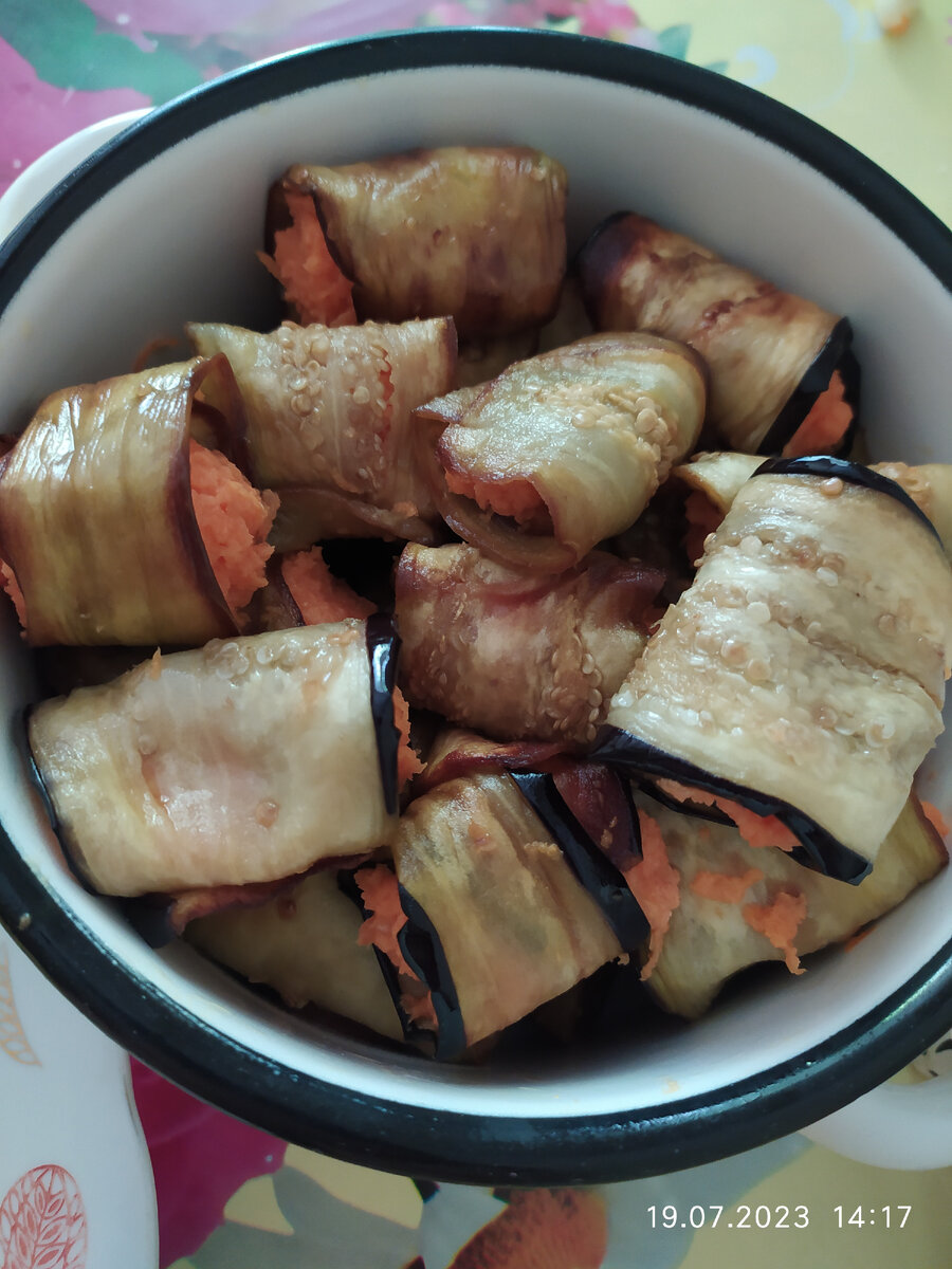 Думаю, что многие умеют готовить это блюдо. Но добавлю его как напоминалку на случай, когда встанет вопрос "что же приготовить? " Баклажаны (на юге их называют "синенькие") помыть, отрезать " Хвостики" и нарезать вдоль тонкими язычками. Язычки из баклажан посолить и оставить минут на 5-10. Затем выделившийся сок слить. С соком уйдет горечь. Обжариваем на раскаленной сковородке с маслом с двух сторон. Заранее готовим начинку: морковь натереть на мелкой терке, добавить чеснок, майонез и тщательно перемешать. Можно добавить к смеси натертый сыр. Теперь на край обжаренного язычка кладём начинку из моркови и сворачиваем рулетиком. Ваши "язычки" готовы. Приятного аппетита!