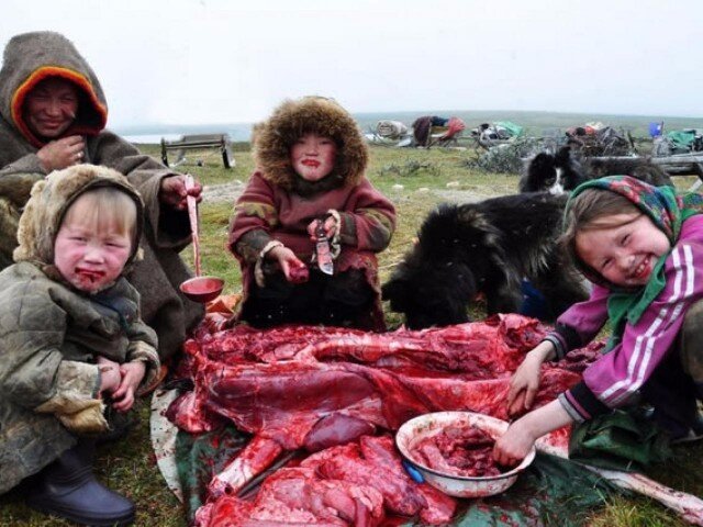 Чукотская национальная кухня весьма экзотична и разнообразна, несмотря на то, что ингредиентов в тундре не так много. В пищу идет все, что растет, бегает, ползает, летает! Для оленеводов главное в тундре – олень! Он одевает, обувает, перевозит и главное, кормит! Причем в пищу используется все, кроме шкуры! Не только мясо, еще и кишки, кровь, мозг, панты, даже желудок со всем содержимым! Оленину чукчи предпочитали есть сырую пока от нее шел пар. Из остывшего мяса готовили сытный и полезный бульон. Однако были блюда, которые вряд ли вы стали бы добровольно есть, разве только будете помирать с голоду! Например, копальха - так называют мясо, рыбу или птицу,которую заготавливали впрок, причем очень необычно: зарывали тушки или куски мяса в подтаявшую мерзлоту, заваливали камнем, отмечали место вешками и оставляли на некоторое время, от нескольких дней до года. Этот своеобразный клад помогал местным жителям на обратно пути или в экстремальных условиях. Однажды команда военных топографов с
