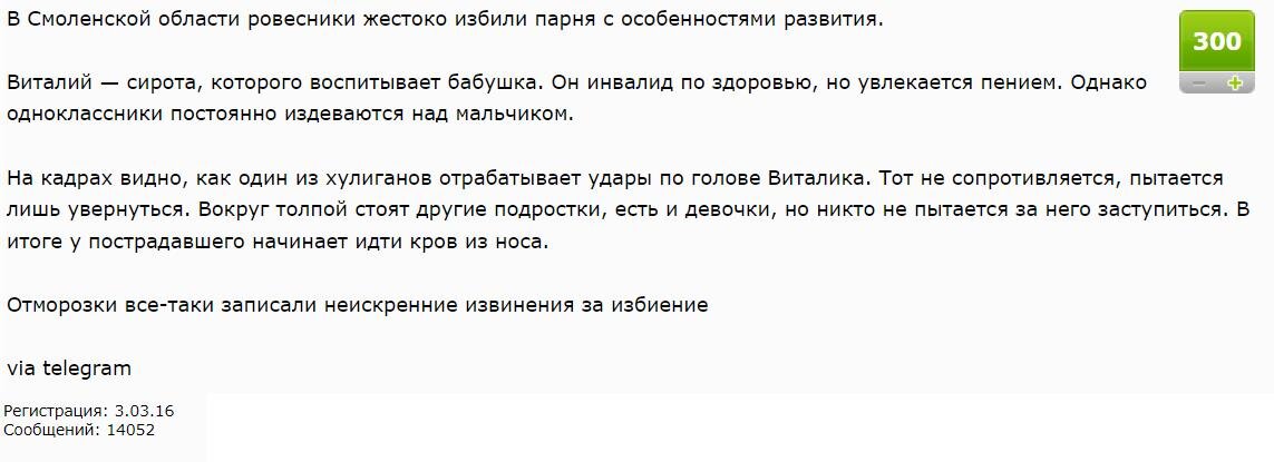 Опять новости об очередном насилии на территории моей Родины. Опять подростки (каникулы для кого-то должны быть строгого режима) избили человека, который не смог постоять за себя - и не мог. Он инвалид. В смысле - записали извинения? Извинения должны происходить по определенной схеме (у нас к сожалению нет культуры раскаяния, если бы она была, преступлений осталось бы единицы - только больные-невменяемые бы их совершали):