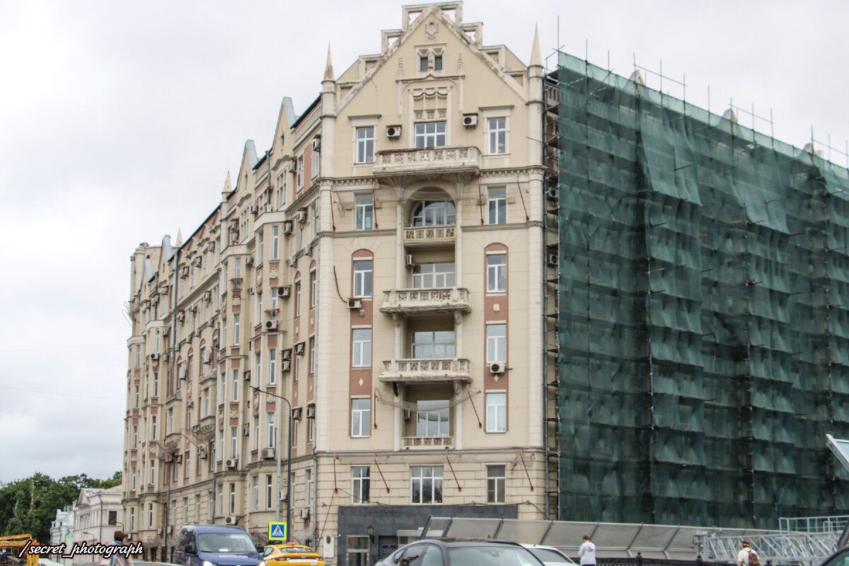 Это массивное псевдоготическое семиэтажное здание я едва-едва успел отснять, прежде чем его убрали в леса к реставрации фасадов. Та сторона, что выходит на Басманный тупик, уже была закрыта сеткой, а прошли буквально два или три дня – и скрылся фасад, что смотрит на Новую Басманную улицу.