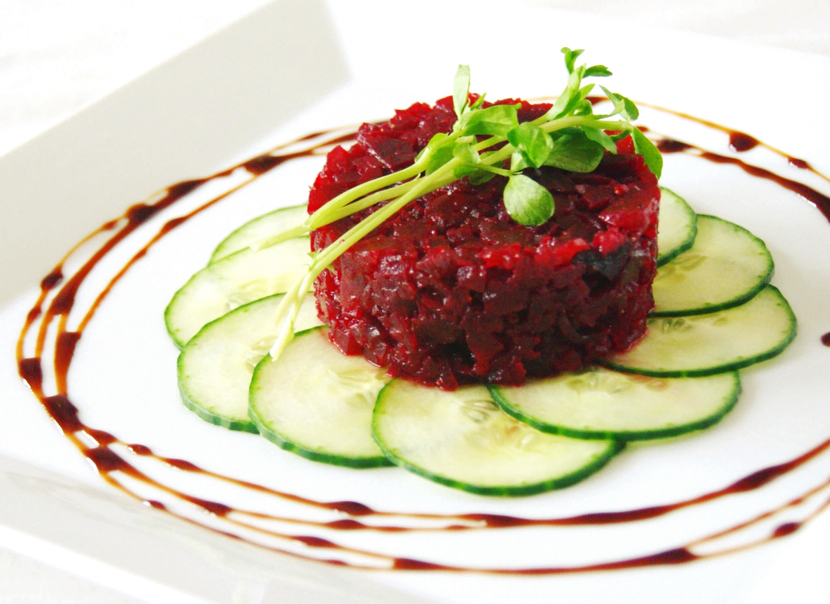 ■ Используя нож для удаления сердцевины яблок, нарежьте свеклу. Половину из получившихся кусочков мелко нарежьте как для классического тартара.