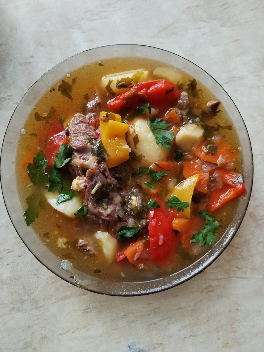 Шурпа – традиционное первое блюдо у многих восточных народов. Узбекистан, Казахстан, Таджикистан имеют свои рецепты этого супа. Идея супа на основе крепкого мясного бульона. Традиционно шурпу делают с бараниной. Это, что касается непосредственно экскурса в историю блюда. Мое же знакомство с ним состоялось после переезда на Кавказ. Причем не меня им угостили, а меня попросили его приготовить. Я сначала слегка запаниковала, затем поискала рецепты, объединила из них разные положения и то, что получилось понравилось абсолютно всем. Не ручаюсь за классическое соблюдение всех правил, поделюсь тем, что многократно проверено мною лично и моими гостями, оставшимися довольными. Для приготовления вкусного супа нам понадобятся: Баранина на кости (700-800 г); Картофель (300-400 г); Болгарский перец (2-3 шт); Лук (1-2 шт);
