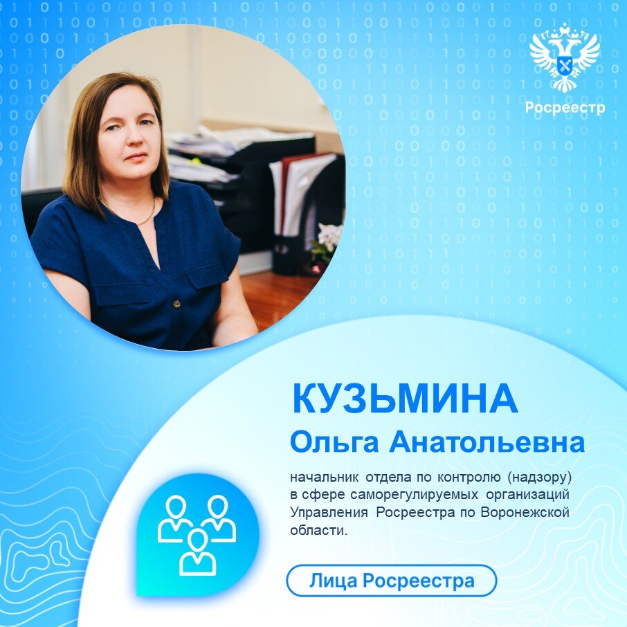 Сегодня мы представляем Кузьмину Ольгу Анатольевну, начальника отдела по контролю (надзору) в сфере саморегулируемых организаций Управления Росреестра по Воронежской области.