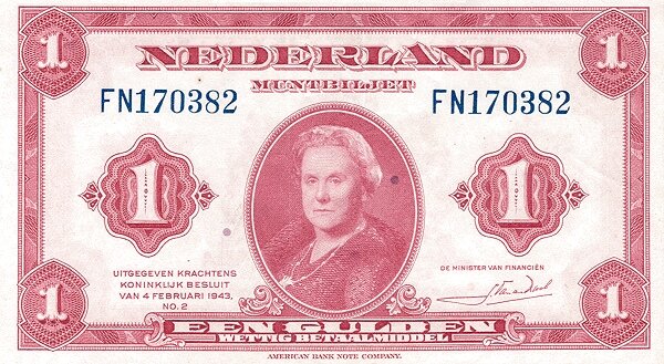 Англо-американские войска, освобождавшие Западную Европу, везли с собой заранее подготовленные банкноты – были среди них и гульдены, выпущенные ещё в 1943 году American Bank Note Company. Их можно сразу же и безошибочно отличить от гульденов всех прочих годов выпуска: слишком уж характерный, «долларовый» у них облик. Оформление, шрифты, узоры – всё как на долларах того времени. В центре – портрет королевы Вильгельмины, на обороте – герб Нидерландов. Достаточно просто и лаконично.