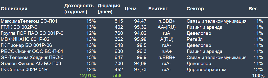 Формируем портфель из облигаций с высоким доходом и умеренным риском. Как мы писали в прошлом посте, при выборе облигаций стоит учитывать несколько параметров, а именно: Предлагаем Вам собрать следующий портфель: Аналитики FV создали оптимальный высокодоходный облигационный портфель исходя из текущей рыночной ситуации Список облигаций (Наименование - ISIN): Средневзвешанная годовая доходность по портфелю = 12.91% Средневзвешанная дюраций = 568 дней Вес каждой бумаги в портфеле = 11-12% Выбор каждой бумаги обусловлен параметром risk/reward (риск/премия). Подобранные бумаги обладают наилучшим соотношением риск/премии. Подробнее: В начале этого года была сделка по покупке МаксимаТелеком Ростелекомом. На фоне этой сделки ожидаем повышение рейтинга Максима и ,соответственно, сужение спреда. При текущей доходности в 14.5% бумага явно недооценена. Данный портфель позволит инвестору зафиксировать доходность в размере 12.91% годовых вне зависимости от курса национальной валюты, цен на нефть/га