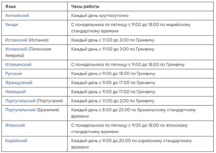 - На странице поддержки, выберите ваш язык из представленной таблицы с рабочим временем поддержки для каждого языка.