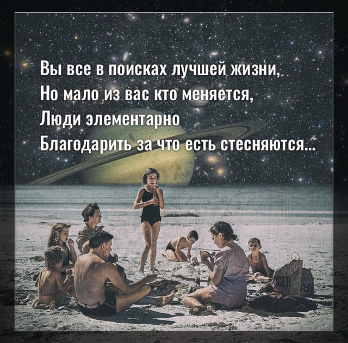 Вы все в поисках лучшей жизни, Но мало из вас кто меняется, Люди элементарно Благодарить за что есть стесняются. Чем-то опять недовольны, Все проблемы от ожиданий! Как объяснить ещё вам, Нет других, кроме ваших страданий! Вы сами же их взращиваете, Холите и лелеете, Но хоть каплю любви отдать в мир Боитесь и очень жалеете! А как вам ещё измениться, Вас Вселенная будет менять И всё, что даёте вы жизни, Будет чётко в других отражать! Нельзя быть такими чёрствыми, Нельзя всё хотеть, но не делать, Нет волшебной пилюли, Чтобы вас всех счастливыми сделать! Работайте над собой, Себя хоть чуть-чуть проявите, Начните мир не ругать, А побольше его хвалите! Радуйтесь за других, Даже если у вас нет причин На то, чтоб сейчас улыбаться, Счастье позже придёт в ваш мир, Излучать когда перестанете Недовольство и скрытую злобу, Вы сами жизнь разрушаете, Обвиняя даже погоду В своих неудачах и грусти, Посмотрите в глаза себе, Вы давно Высших благодарили Хотя бы за свет в окне?