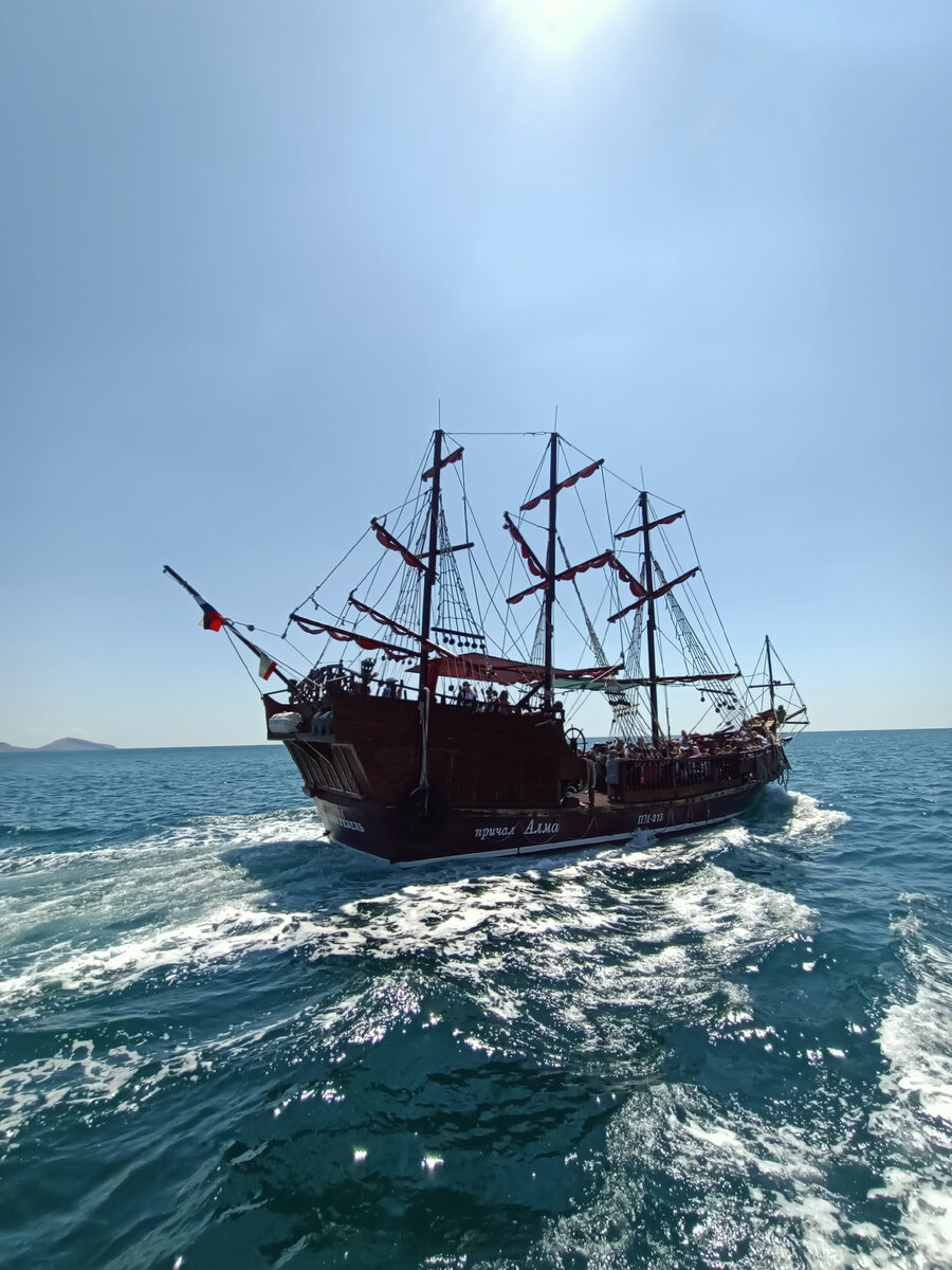 Кто не был на Карадаге? Об экологической экскурсии по самому Карадагу я писал здесь: Прогулка по Коктебельской набережной не очень простая штука. Зазывалы работают на каждом углу, как на рынке из известной в прошлом песни, только слова поменялись: При этом о путешествии на кораблике рассказывают на каждом углу. Все продавцы экскурсий обязательно имеют эту экскурсию! Ну, а как не посетить самое известное место Коктебеля - "ЗОЛОТЫЕ ВОРОТА"! Со склона Карадага Золотые ворота видел, теперь с моря! К Карадагу ходят три небольших стилизованных под роман Грина кораблика под Алыми парусами: "Секрет", "Ассоль" и "Грей". Два из них "Секрет" и "Ассоль" проходят сквозь Золотые ворота, а "Грей" из-за больших размеров не пролезает! Я взял экскурсию на 9.30 на кораблике "Секрет", но так как гости Коктебеля в это время чаще всего не просыпаются, то группа не набралась. Билеты поменяли на 10.00. Кораблик должен был быть другим - "Ассоль", но и он, также как и "Секрет" проходит сквозь арку Золотых воро