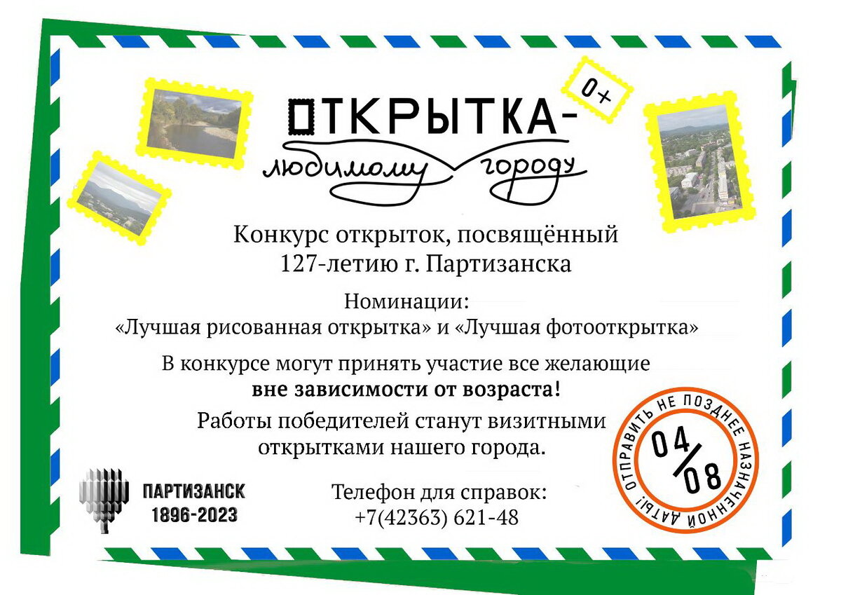 В преддверии Дню города и Дня шахтера, с целью создания условий для формирования интереса к истории родного края, воспитания чувства гордости и любви к своей малой родине, модельная библиотека объявила конкурс открыток, посвященный 127-летию г.Партизанска «Открытка любимому городу». Конкурс проводится в период с 15 июля по 26 августа 2023 года: 1 этап - с 15 июля по 4 августа 2023 года - приём конкурсных работ; 2 этап - с 7 августа по 11 августа 2023 года - оценка представленных работ, определение победителей; 3 этап – с 21 августа по 25 августа - издание открыток победителей Конкурса на базе модельной библиотеки г. Партизанска. Открытки принимаются в двух номинациях «Рисованная открытка» и «Фотооткрытка». На конкурс принимаются: – изображения рисунков, выполненных в цветном исполнении на бумаге формата А4 в любой технике, с использованием средств рисования – цветные карандаши, акварельные краски, фломастеры; – работы, выполненные в виде коллажей и аппликаций, выполненные другими средс