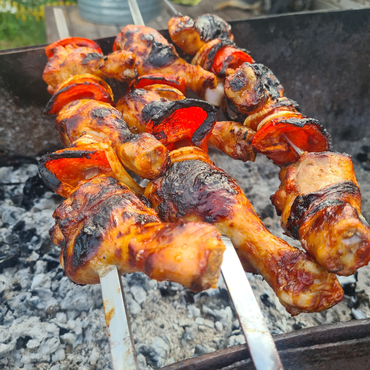 Лето, пятница, впереди выходные, значит пора жарить шашлыки. Сегодня расскажу вам рецепт куриного шашлыка Чахохбили. Вкусный соус, жаренный болгарский перчик и лук, шашлык получается просто великолепным. Обязательно попробуйте. А для приготовления нам понадобится: Для соуса: Готовим. Курицу промываем, складываем в миску. У меня были голени, с ними я ничего не делаю. Если у вас, к примеру, грудка, тогда режем её на средние кусочки; бедрышки - при необходимости разрезаем. Кстати, мне очень нравится грудка в таком шашлыке, она очень сочная и вкусная получается. К сожалению, в морозилке в тот момент были только голени, а в магазин ехать не хотелось, далековато. Затем режем лук. Я люблю резать кольцами, чтобы его тоже пожарить. В магазинах часто его режут на 4 части (так быстрее видимо), так тоже потом можно надеть на шампуры, но довольно часто он ломается, поэтому я режу кольцами. Болгарский красный перчик очищаем от зернышек и режем на 8 частей. Отправляем также к шашлыку. Теперь зай