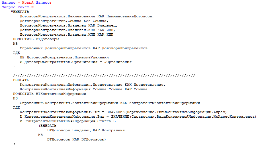Итак, в созданном выше тексте запроса временная таблица ВТДоговоры использовалась дважды. При создании временных таблиц: ВТКонтактнаяИнформация, ВТДополнительныеСведения.