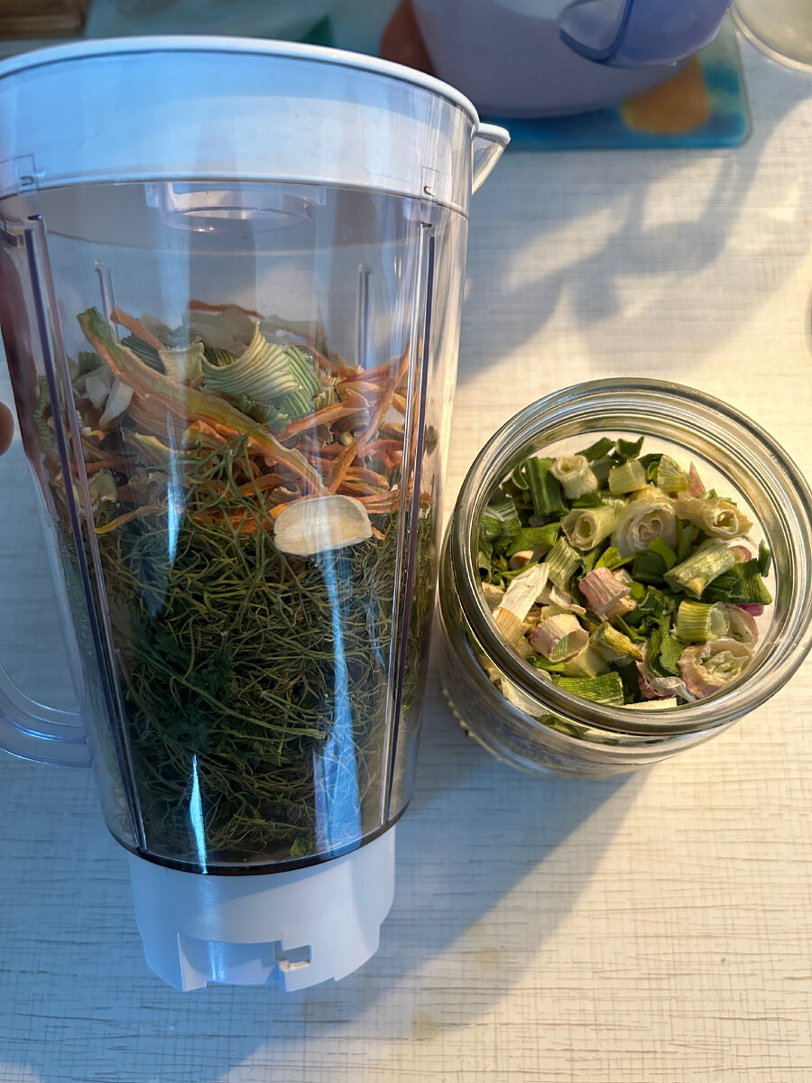 В сушилке высушила укроп, петрушку, лук, чеснок, морковь и сельдерей. Пробила все это в блендоре и получилась небольшая мисочка специй. Переложила в баночку объемом 330г и добавила 6 чайных ложкк соли для лучшего хранения. Такого объема специй должно хватить на долго. Планирую добавлять в супы. Чуть позже буду сушить отдельно укроп и чеснок. Добавляю их практически во все блюда. Еще сейчас изучаю информацию по ягодам, думаю может тоже что-то засушить.