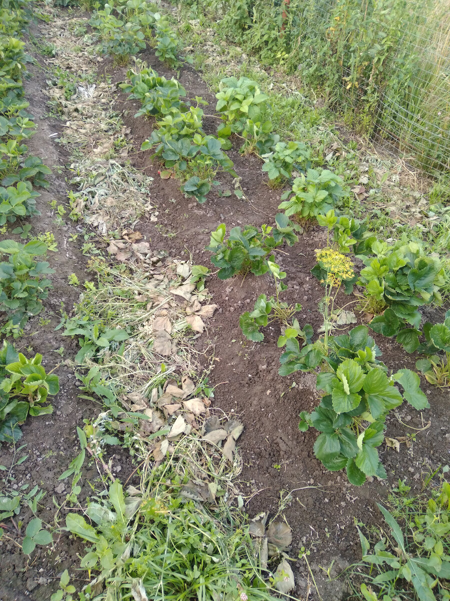 Всем привет. Если честно, в огороде номер 2 особо похвастаться нечем. Вот осилила прополку клубники. В промежутках между дождями и работой целых две недели третий раз полола клубнику и обрезала усы, а заодно и старые листья обчекрыжила. Сил траву убрать между рядами не осталась, отложила на потом, но она так хорошо подсохла, что пока решила оставить. До этого лежала темная ткань от сорняков, но она со своей задачей справлялась плохо, трава все равно через нее пробивалась. Поэтому с грядки ткань убрала. Урожай был средний, но уход за клубникой продолжается. В планах подкормить ее кроличьим удобрением. Кроли стараются зелень перерабатывают, сами растут. Урожай капусты выдался на славу, качанки завязались отличные, один уже срезала, буду снимать пробу. Напомню, весной сажала рассаду в теплице сорт июньская. В огороде №3, что в деревне, капуста стоит тоскливая🥴, качаны только начали завязываться. Вот и думаю, эксперимент по посеву горчицы в капусте от блошки и другой нечести прошел не у