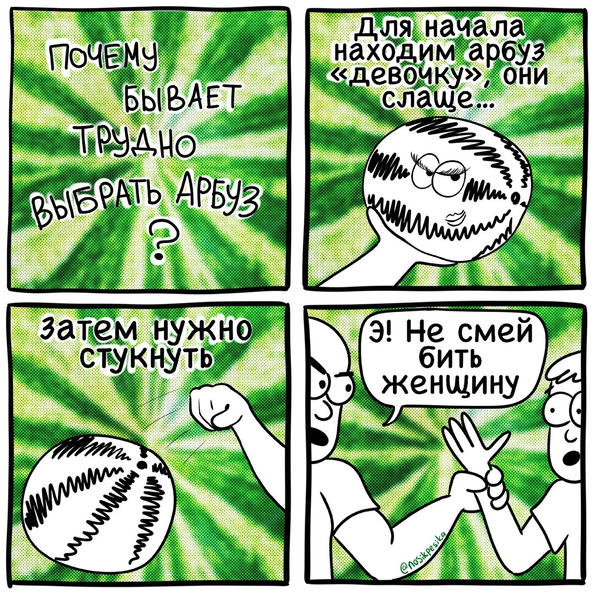 Делать в августе подборку комиксов про арбузы уже становится традицией (ссылку на прошлогоднюю статью вы сможете найти в конце этого материала). Конечно же, особенно много комиксов на эту тему обычно выходит летом, так что к последнему месяцу теплого времени года их уже успевает накопиться достаточное количество. Так что спешу поделиться с вами сочными арбузными зарисовками! Надеюсь, что вам понравится. И обязательно пишите в комментариях успели ли вы уже налопаться арбузами в этом году. Автор серии комиксов Носик Пёсика рисует комиксы на разные темы, в которых часто фигурирует игра слов и абсурдный юмор. В одной из своих работ этот художник решил наглядно объяснить, почему иногда бывает так трудно выбрать хороший арбуз. Что тут скажешь - объяснение получилось крайне неожиданным. Иллюстратор под ником ZaTaS тоже решил изобразить последствия постукивания по арбузу - получилась еще одна вариация на эту тему. Кто вспомнит, к какому мему отсылается эта картинка? Художница под ником Ilmiran