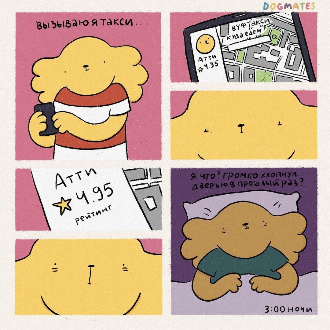 Чем чаще какое-либо действие или занятие встречается в повседневной жизни, тем больше можно найти шуток на эту тему. Поэтому интернет завален комиксами про еду, сон и работу. Но и другие сферы жизни могут находить отражение в забавных сюжетах. К примеру, многие из нас хоть иногда пользуются такси - во время спешки или когда нужно добраться до труднодоступной местности. В общем, сегодня я как раз собрал для вас десятку отличных комиксов на эту тему. Надеюсь, что они вам понравятся! Cерия комиксов пёсьи друзья (или dogmates) за авторством московской художницы по имени Майя (в сети ее можно найти под ником maya.karakuli) - это милые и смешные истории из жизни пса Атти и его друзей. Однажды Атти решил вызвать такси, а что из этого вышло - читайте сами. Автор серии комиксов Носик Пёсика решил пошутить над тарифами такси, которых в последнее время появляется все больше и больше. О том, что предполагают некоторые из них, сложно понять, пока сам все не попробуешь. Художница под ником Lin в с