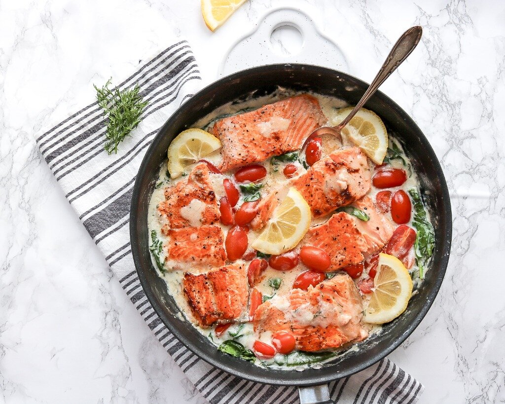 Ингредиенты Рецепт приготовления 1. Сначала посыпьте кусочки лосося солью и перцем. Также сбрызгиваем лимонным соком. 2. На сковороде разогрейте масло. 3. Добавьте кусочки лосося и обжаривайте несколько минут с обеих сторон. 4. Отставляем жареные кусочки лосося в сторону. Очистите сковороду. 5. Нагрейте сковороду до средней температуры. Растопите масло и обжарьте чеснок около 30 секунд. 6. Затем добавьте сливки, бульон, кукурузный крахмал / муку, смешанную с водой. Перемешать и нагреть до кипения. Снижаем температуру. 7. Добавляем шпинат. Перемешивайте их примерно одну минуту. 8. Затем добавляем помидоры, укроп, лимонный сок и перец. Все перемешали. 9. Добавить кусочки лосося и обжаривать 3-4 минуты. Подавать на стол. Приятного аппетита!