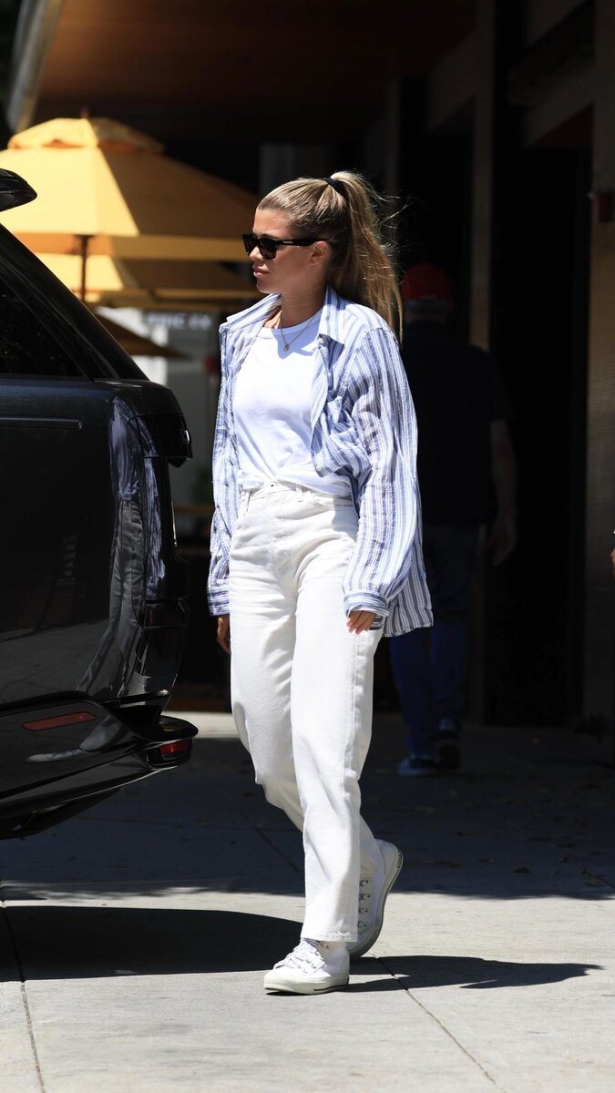Как выглядеть модно и одновременно просто — знает София Ричи. Знаменитость надела лаконичную белую футболку, перед которой она небрежно заправила в прямые джинсы молочного оттенка на высокой посадке. Акцентом в образе стала объемная рубашка в синюю полоску, которая балансирует белый тотал-лук. Завершением выхода стали сумка-шопер из кожи, лаконичные кроссовки, подвеска и стильные солнцезащитные очки.