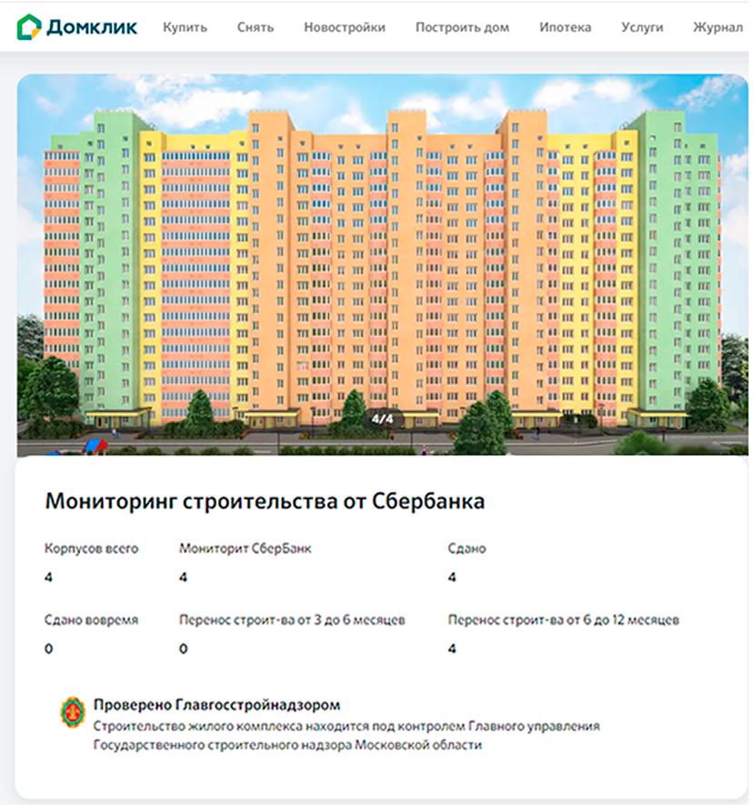 На общероссийских порталах «ДомКлик», «ЦИАН» и «Метр квадратный» есть маркировка надежности «Проверено Главгосстройнадзором». Отметка автоматически присваивается объявлениям с проверенным застройщиком в Подмосковье. Переход по такой метке помогает потенциальному покупателю узнать о надежности застройщиков, причинах блокировки регистрации ДДУ и принять выверенное и безопасное решение об участии в долевом строительстве. За период с 2019 года специальный цифровой счетчик зафиксировал более 6 млн просмотров метки Главгосстройнадзора на порталах по продаже и покупке недвижимости.