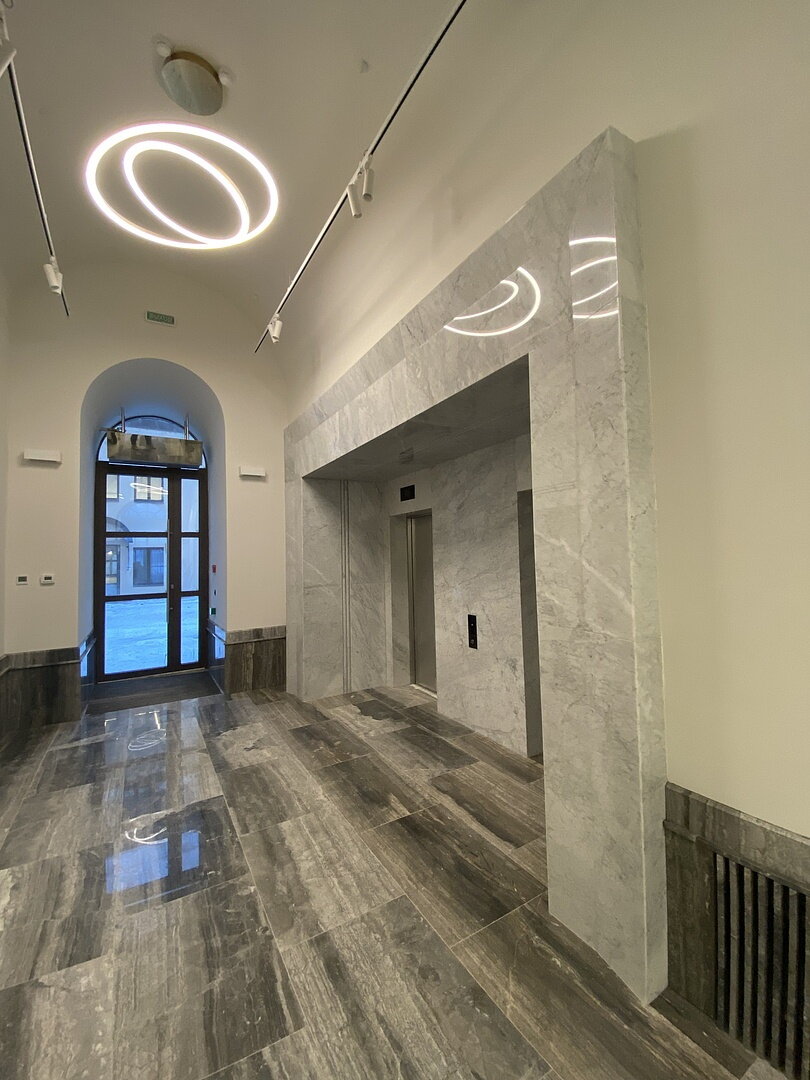 Облицовка лифтового портала в БЦ Сенатор, мрамор Bianco Carrara