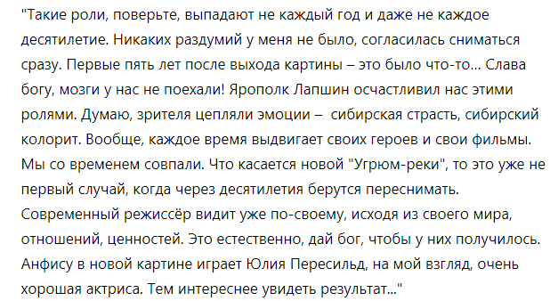 20 июля 2021 года 82-й день рождения встречает Народная артистка РСФСР (1969) и Народная артистка СССР (1981), Лауреат Государственной премии РСФСР им. братьев Васильевых за участие в фильмах "Виринея", "Угрюм-река", "Журавушка" (1970), обладательница приза "Серебряная раковина" лучшей актрисе XVII МКФ в Сан-Себастьяне за фильм «Журавушка» (1969), Лучшая актриса 1969 года по опросу журнала "Советский экран" Людмила Алексеевна Чурсина. Впервые появившись на экране в 1961 году (сразу в двух фильмах), актриса не знала простоев. На сегодняшний день у неё более 140 работ в кино- и телефильмах/сериалах (последнее фото под материалом - кадр из сериала этого года "Анатомия убийства-4") и очередная премьера - на подходе. Так что, интерес зрителей к работам Людмилы Алексеевны был постоянно высок. Но в этом году он стал, так сказать, “заоблачным” благодаря выходу новой экранизации романа Вячеслава Шишкова “Угрюм-река”. Вердикт зрителей был однозначным - новая версия во всём уступает четырёхсерий