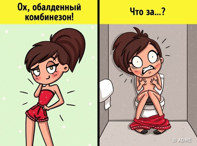Без чего не выходит из дома ни один человек? Если вы подумали что без ключей или телефона, то нет, из дома не выходят без одежды. Если конечно не брать в расчет некоторые племена, но как мне думается, даже в самые дремучие папуасские острова уже давно пришла цивилизация. В связи с необходимостью носить одежду, все мы стали сталкиваться с ежедневным выбором, что надеть, будет ли это уместно и яростно мечтаем о том дне, когда уже производители дезодорантов прекратят добавлять в свою продукцию то, что оставляет на одежде белые следы. Художники комиксисты не могли пройти мимо такой многообещающей темы и нарисовали комиксы о выборе одежды кто во что горазд. И, как показала практика, женский и мужской взгляд на подбор наряда кардинально отличаются. Давайте пройдемся от самых нашумевших и набивших оскомину до мало известных комиксов и посмотрим на творчество художников. Шутки про комбинезоны и посещение туалета уже можно считать классическими. Такой вариант нарисовала Астхик Ракимова для порт