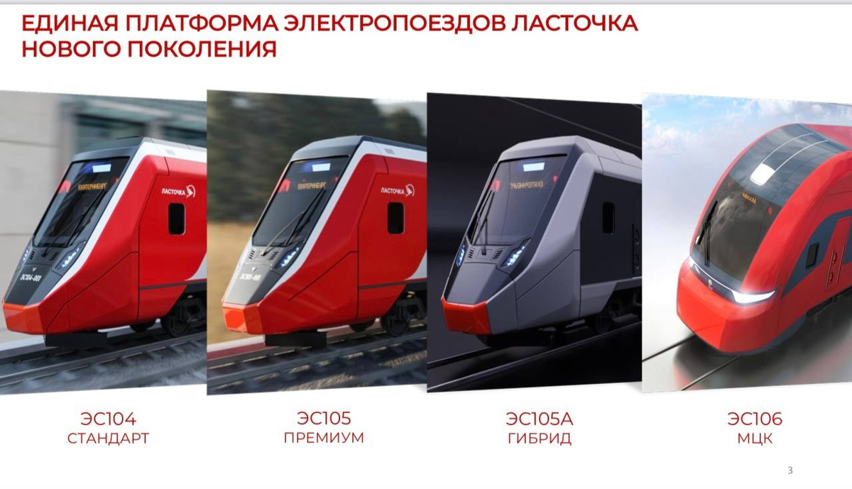 Наш канал уже писал о скоростном электропоезда ЭС-104, так называемой импортозамещенной "Ласточке", при этом в прессе еще встречалось альтернативное название поезда, как "Восток". Обновленная "Ласточка" имеет модульную конструкцию, что позволяет создавать разные версии поездов, в зависимости от их назначения. На текущий момент заявлены модели: -ЭС104 импортозамещенная "Ласточка". Построен опытный состав. Имеет 3 туалета и более комфортабельные кресла относительно прежней версии, носится к классу стандарт; - ЭС105 (в планах на 2024 год) - относится к классу премиум и будет иметь кресла с откидными спинками, места бизнес-класса, места для велосипедов/самокатов; - ЭС105А (в планах на 2025 год) - для пассажиров это будет состав, аналогичный поезду ЭС105, но состав будет оснащен аккумуляторами для движения по неэлектрифицированным участкам, сколько автономного хода будет иметь поезд, пока не сообщается; -ЭС106 (в планах на 2026 год) - версия "Ласточки" для МЦК, вагон будет иметь отличную о