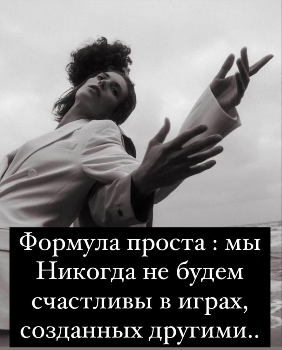 Формула очень проста: мы никогда не будем счастливы в играх, созданных другими. Мы будем счастливы только в играх, которые создали сами. Если вы спросите себя: «почему я несчастлив», ответ прост. Потому, что не вложил свою персональную творческую силу, кровь, пот, талант в свою мечту. — Возможно, тебя этому не научили. Ты всегда выполнял чьи-то «домашние задания», начиная со школы и детского садика. Выполнил – хорошо. Не выполнил – два. Ты сам позволил спрограммировать себя в исполнительских моделях. Твой персональный творческий алгоритм атрофировался. Теперь ты спрашиваешь меня и себя, почему я несчастлив? Демчог Счастливым человек может быть только в процессе творчества своей собственной игры. Если он не обладает навыками, способными переписывать доставшийся из детства и нашпигованный комплексами родителей, сценарий своей жизни, то он очень важный винтик социальной машины, потому что она держится на таких винтиках. А культурологи стонут: «Мы взрастили поколение потребителей, это сама