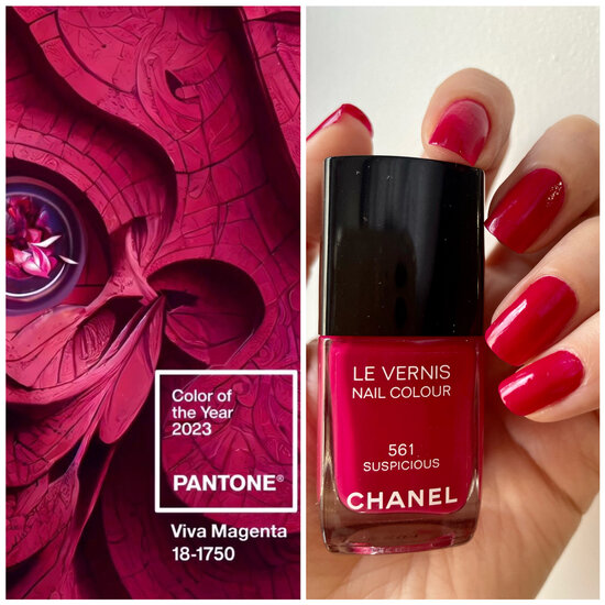 Всем привет!) Всегда интересно каким же цветом окрасит год институт Pantone. И в 2023 это потрясающий оттенок viva magenta. Глубокий, насыщенный розовый. Я очень люблю подобную гамму. Открыла свою лаковую сокровищницу и нашла потрясающий Chanel №561 Suspicious. С ним Вас и познакомлю сегодня. Chanel Le Vernis №561 Suspicious — лак из коллекции Les Essentiels de Chanel, которая увидела свет в 2012 году. Поэтому его можно смело назвать раритетом. Помимо Suspicious были выпущены знаменитые 563 Vertigo и 559 Frenzy. Итак, мой экземпляр Suspicious продавался в стандартной для лаков Шанель черной коробке. Сверху номер и название оттенка. Это помогает быстро отыскать нужный лак в ящике. Флакон традиционной прямоугольной формы с узким горлышком. Дно из прозрачного толстого стекла. Создается впечатление, у меня по крайней мере, что лак висит в воздухе. Выглядит красиво. Снимаем верхний колпачок и тут мы уже видим саму ручку и рабочую поверхность кисти. Поверхность ручки ребристая. Пальцы по н