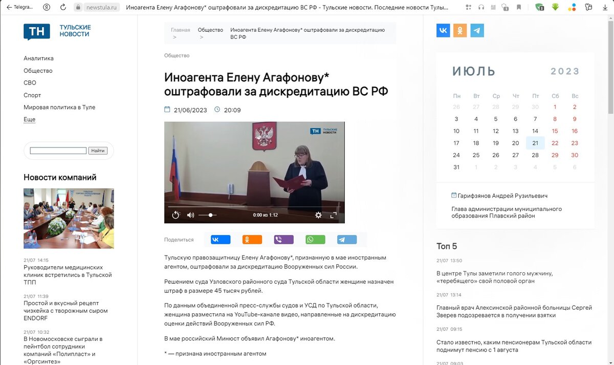 А опубликовали статью "Иноагента Елену Агафонову оштрафовали за дискредитацию ВС РФ", в которой указывают: