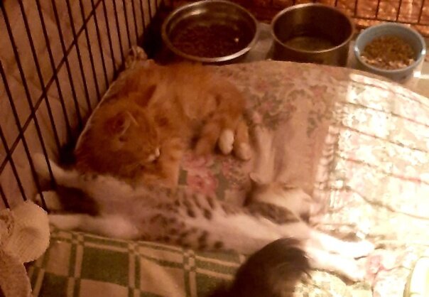 А какого нам теперь? Держались до последнего, не забирали. Но кошачий ребёнок так плакал, так звал маму, так хотел домой, что сердце не выдержало. Пошли на риск, подселили к 2-м котятам, они здоровые, но не привиты. Мест нет совсем, все клетки заняты. Теперь молимся.