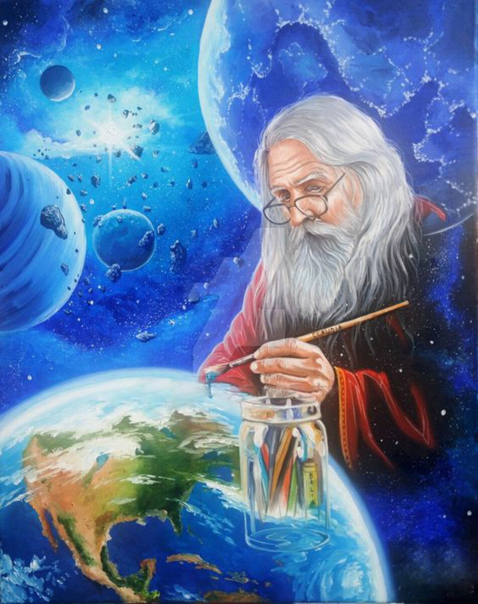 - В начале Бог существовал вечно и создал небо и землю. Земля была безобразной и пустой, и над бездною висела тьма, и Дух Божий двигался над водами.