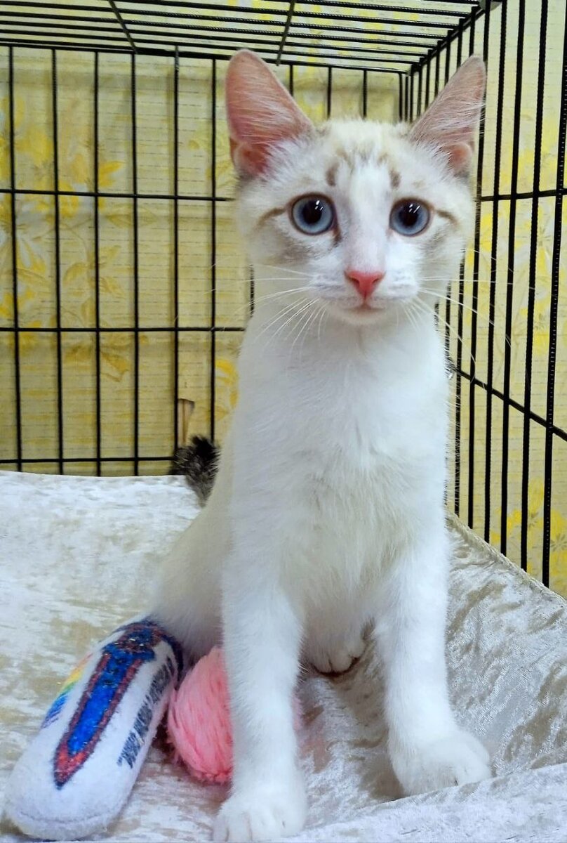 Этого голубоглазого малыша, больного и с лишаем, поймали наши девочки-волонтеры Аня и Наташа. Маленький, испуганный кошачий ребёнок был в огромном стрессе, шипел и постоянно пытался сбежать. Но внимание и забота его куратора Ани, а также длительное лечение лишая - все это поспособствовало тому, что малыш стал потихоньку привыкать, страх ушёл и он превратился в очаровательное создание с небесными глазками, весело скачущий по клетке играя в игрушки.
